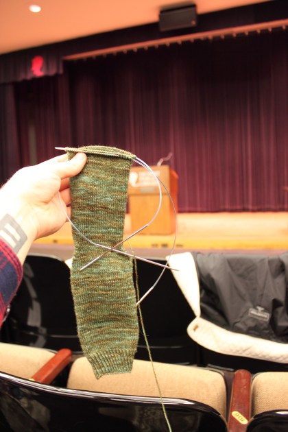 after a couple hours of just sitting there knitting, borrowing strangers’ measuring tapes, and a phone call for a last minute kitchner stitch refresher, i finished my second sock!