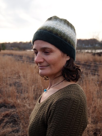 wearing the green mist bohus hat i knit a while back.